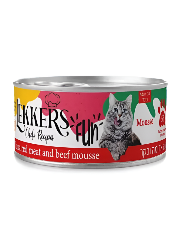 מעדן מוס איכותי לחתולים מבית LEKKERS, המשלבת טונה אדומה ובקר. שילוב הטעמים הייחודי יוצר ארוחה מפנקת ועשירה במיוחד, שגם חתולים בררנים מתקשים לעמוד בפניה.