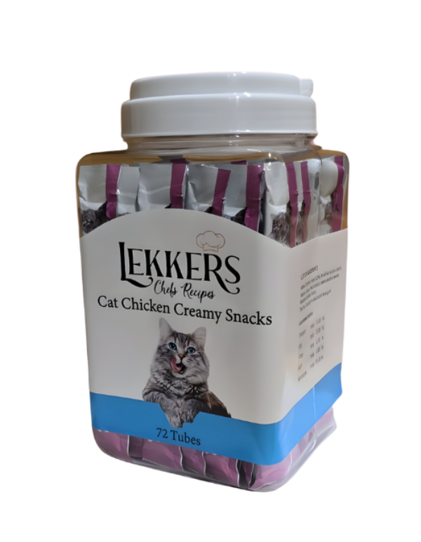 מארז גדול ומשתלם של שלוקים לחתולים מבית LEKKERS, המכיל 72 יחידות של מעדן לחיץ בטעם עוף – פינוק רך, עשיר וטעים במיוחד שכל חתול פשוט לא יכול לעמוד בפניו.