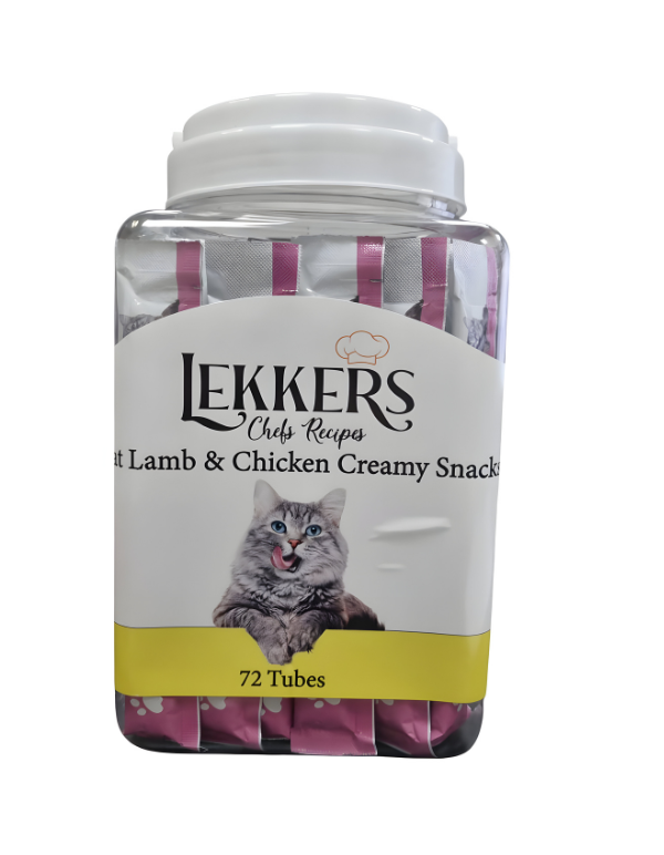 מארז גדול ומשתלם של שלוקים לחתולים מבית LEKKERS, המכיל 72 יחידות של מעדן לחיץ בטעם כבש ועוף – פינוק רך, עשיר וטעים במיוחד שכל חתול פשוט לא יכול לעמוד בפניו.